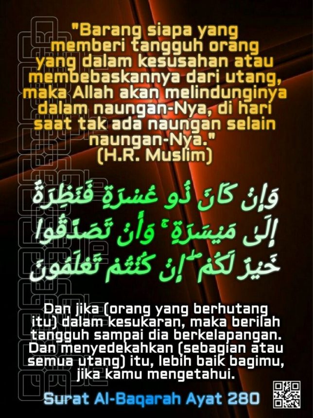 “Dan jika (orang yang berhutang itu) dalam kesukaran, maka berilah tangguh sampai dia berkelapangan. Dan menyedekahkan (sebagian atau semua utang) itu, lebih baik bagimu, jika kamu mengetahui.”